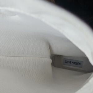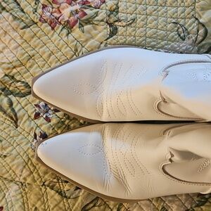 This is a pair of white, leather Steve Madden boots size 9.5m. They are in very good used condition. The toe of the left boot has scuff damage as shown in pics.