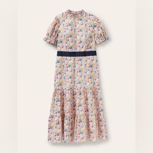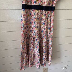 Charming floral midi dress by Boden. Features a colorful floral pattern. Navy band at the waist. Adorable summer piece!