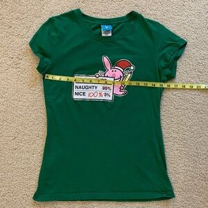 Green cotton y2k Christmas tee with "Naughty 95% Nice 100%" slogan #ChristmasVibes #HolidaySpirit #kidcore #y2k. 100% cotton. See pictures for measurements. Label: It's happy bunny (Jerry Leigh Jim Benton) Junior Size 11/13. Material stretches.