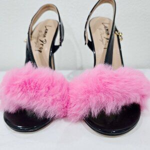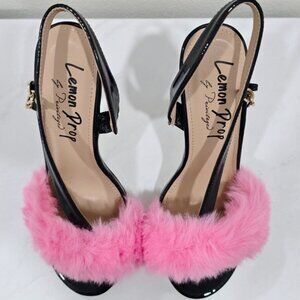 Lemon Drop ✦ Lerpa Fuzzy Heels ✦ Black Vegan Leather Pink Fur Peep Toe Stiletto