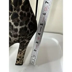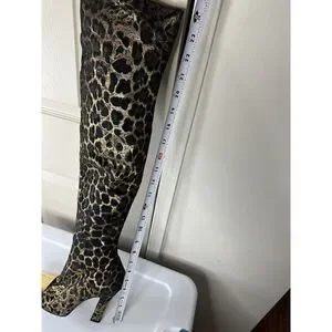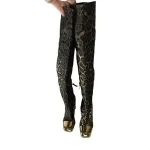 Elegant over the knee boots with a striking leopard pattern. Features a chic gold and black design. Perfect for a bold fashion statement.