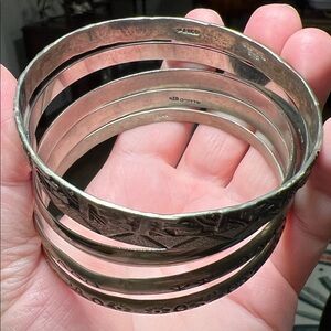 Stylish set of 5 silver tone bangles with unique patterns. Perfect for adding a touch of elegance to any outfit.