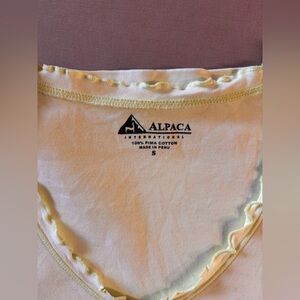 This is an Alpaca International short-sleeve v-neck t-shirt with ruffled trim.