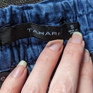 "These lightweight blue chambray jogger pants from Tahari have cute button ankle details and cargo style front patch pockets. Attached tie waist. In very good used condition, some light signs of all over wear, but no noted flaws.