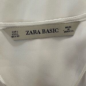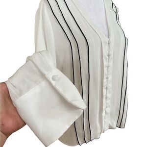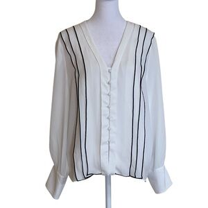 Zara Basic White Semi-Sheer Blouse Sz L Black Detail Ruffles Long Sleeves V Neck