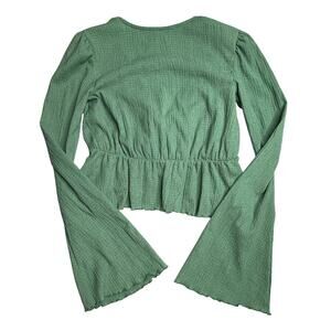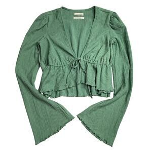 tie front top, bell sleeve blouse, ruffle peplum, sage green crop top, boho chic, Y2K fashion, indie style, festival outfit, long sleeve crop, retro inspired