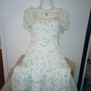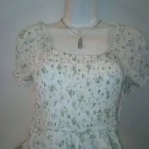 Charming floral dress with puff sleeves. Features a delicate green and white pattern. size medium necklace comes with dress measurements 13 and 1/2 from pit to pit 12 and 1/2 and waist material is stretchy 27 inches in length