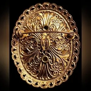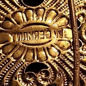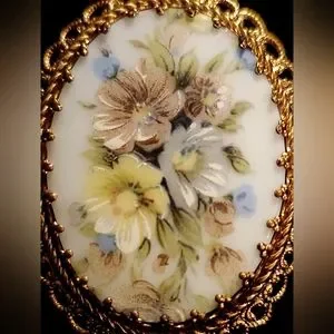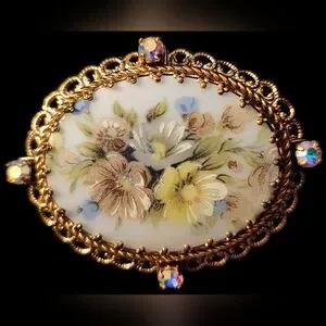 Porcelain cameo with hand-painted with delicate flowers, surrounded by goldtone metal accents & Aurora Borealis rhinestones