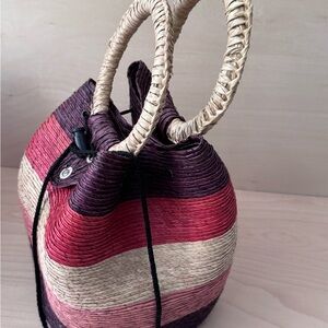 Beautifully woven with natural straw fibers, this tote features bold burgundy, red, cream, and blush pink stripes. Finished with sturdy wrapped ring handles and a drawstring closure, it’s a practical yet stylish accessory for any occasion.