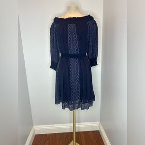 Step out in style with this elegant navy lace off-shoulder dress. Perfect for any occasion, this dress features intricate lace detailing and a flattering silhouette. Ideal for adding a touch of sophistication to your wardrobe.