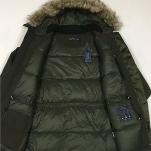 Brave the elements in pure Polo style with this 650-fill-power down coat. In addition to its water-repellent properties, it features a substantial hood with removable faux-fur trim.