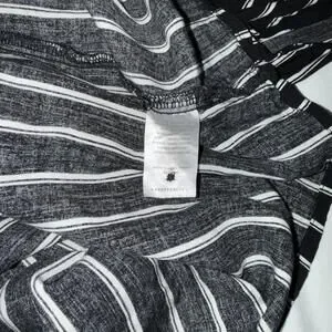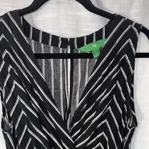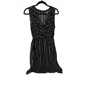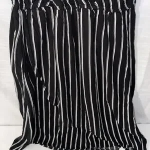 Sleeveless black dress with white vertical stripes.