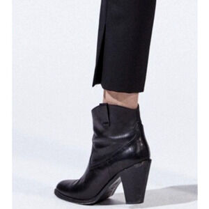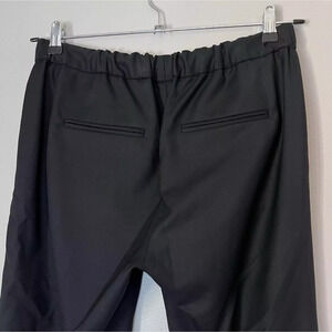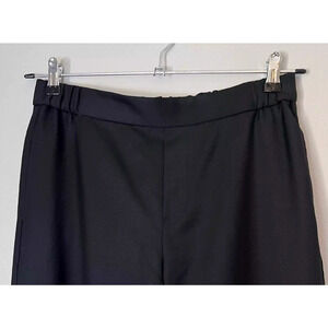 A black wool pant with an elasticized waistband, side pockets, back welt pockets.Cropped length. Flat Front. Mid rise, relaxed fit. Side Slit at ankle. Made in USA. New with partial tags.