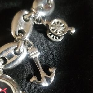 Elegant silver bracelet watch with nautical-themed charms. Features anchor and ship motifs.