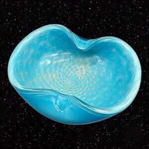 Murano Mid Century Art Glass Bowl Ashtray Blue Gold Aventurine Glitter 5”W 2”T