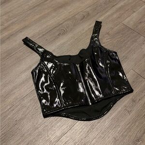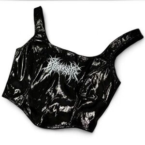 Stylish corset top featuring a unique white graphic design. Perfect for casual outings or a night out
