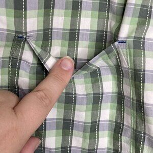 Tommy Bahama Jeans Island Crafted Men’s Large Green White Plaid 100% Cotton Shirt Sleeve Logo Button Up Topstitching Accent Shirt
