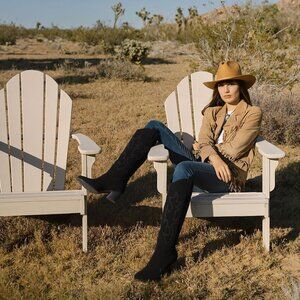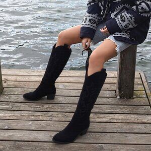Women Polyurethane Black Suede Cowgirl Embroidered Pull-On Knee High Chunky Boot