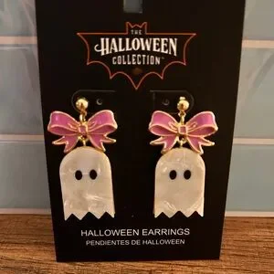 Charming ghost earrings with pink bows. Perfect for Halloween festivities.