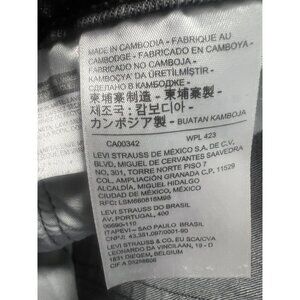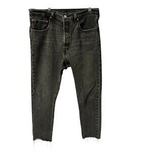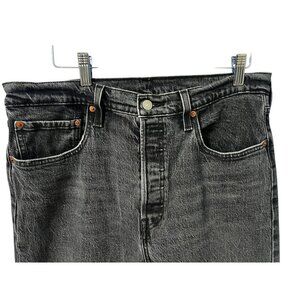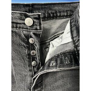 A classic pair of Levi's 501 jeans in a black distressed wash, featuring a button-fly closure and iconic styling. Ideal for casual wear, these jeans offer a straight-leg design and a comfortable fit. The raw hem adds a trendy, rugged touch to the timeless look.