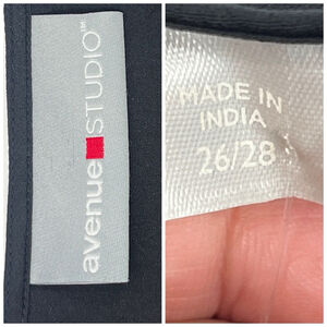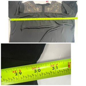 Add a touch of elegance to your wardrobe with this beautiful black beaded top tunic from Avenue. With long bell sleeves, and a round neckline, this blouse is perfect for any occasion - whether it's a business meeting, a party, or a travel adventure. The hook and eye closure adds a touch of sophistication, while the polyester material ensures comfort and durability. This tunic comes in a plus size 26-28 and is suitable for all seasons - winter, summer, fall, and spring. The beaded accents give this blouse a unique and stylish look, while the tunic style adds a touch of modern sophistication. Made in India, this blouse is a great addition to any woman's wardrobe. New with tags, No rips, holes, or stains. Measurements in photos.