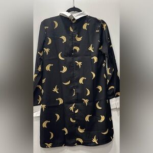 Chic black dress with playful banana print. English Factory sold at Anthropologie Features white collar and cuffs. Perfect for casual outings.