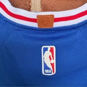Stylish blue NBA jersey with red and white accents.