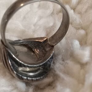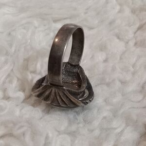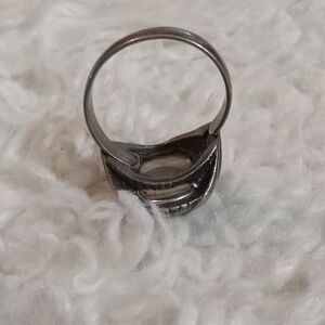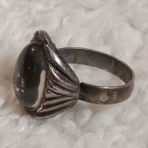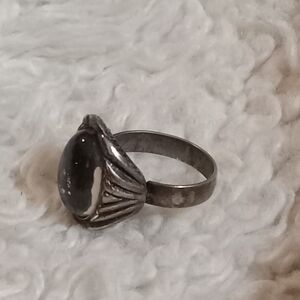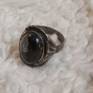 Stylish ring featuring a black stone set in silver. Perfect for any occasion. please look closely at last photo the black part on the inside broke off somehow vintage adjustable men's size ring