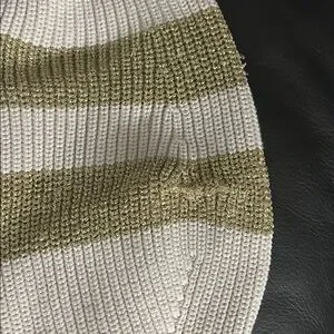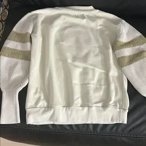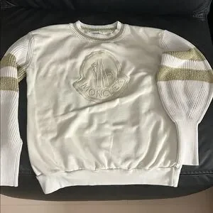 Elegant Moncler knit sweater in cream with gold stripes. Features a large logo on the chest. Used