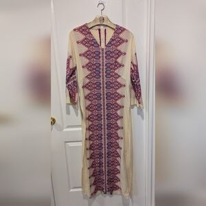 Stylish bohemian dress featuring intricate red and blue patterns. Perfect for casual outings. This belonged to our Mother and was bought in the 50's/60's/70's in Greece. She may have never worn it. I don't ever remember seeing her in it. The embroidery is flawless. There are darts at the chest, see picture. The sides are open from the mid hip. Its in excellent condition with one spot where the sleeve is joined to the body where the fabric missed a few stitches. It also has age spots.