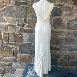 This sophisticated cream crepe gown features an ultra-flattering fit: perfectly pintucked surplice neckline, deep cowlback, and a subtle train. We love it with an embellished sash and sparkly earrings.