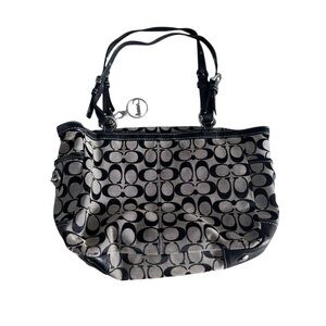 The Authentic COACH Pleated East West Gallery Signature Handbag Purse in the Poppy style is a versatile and stylish accessory for women. Made of canvas and leather, this medium-sized handbag features a black C monogram on light gray exterior color, with silver hardware accents. It includes a zipper closure and three inside pockets, making it perfect for various occasions such as business, casual outings, weekends, or travel. Additionally, it comes with a silver Coach hang tag, adjustable strap, and bag charm, adding to its practicality and elegance. With a spacious design and bottom studs, this handbag is a must-have for everyday use.