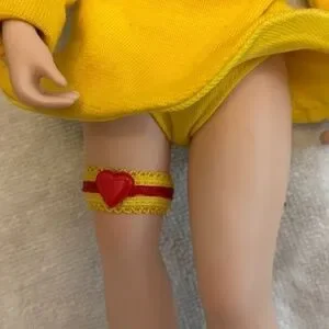 Porcelain Betty Boop figurine from 1995 standing on a pedestal. She is wearing a yellow dress, matching hat with a red feather, and yellow shoes. She is holding shopping bags labeled "Boopies". She has gold earrings. The figurine comes with a pedestal.