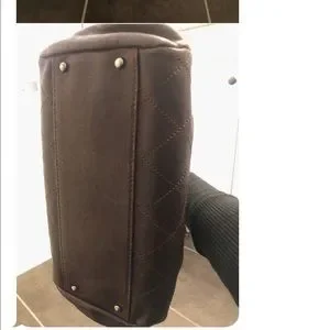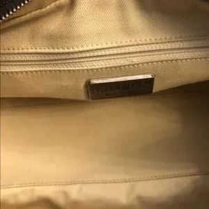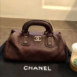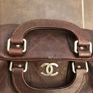 Elegant CHANEL satchel in rich brown. Features iconic logo and sturdy handles. Perfect for any occasion.