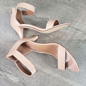 Chic nude patent sandals. Features ankle strap and low heel. Perfect for any occasion.