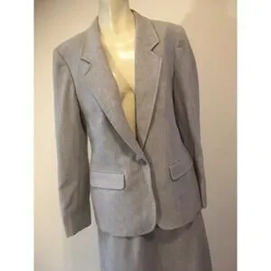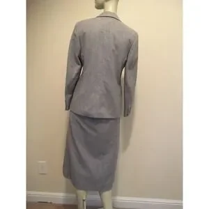 Women's light gray skirt suit has been gently worn with no snags, tears or major stains. Super chic and classic, the blazer if fully lined with a single button front entry and two front side pockets. The skirt is also fully lined and has two side pockets, and a side button entry. This will be a great addition to any fall/winter wardrobe.