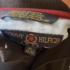 The product is a vintage Tommy Hilfiger black polo shirt in size XL, featuring a solid pattern with a collared neckline and long sleeves. Made of cotton knit fabric, this pullover shirt is suitable for various occasions including travel, activewear, parties, and casual wear. With a preppy theme and classic spread collar style, this breathable shirt is ideal for all seasons and can be machine washed for easy care. Perfect for those who appreciate timeless style and pinehurst 1895 golf-inspired design.