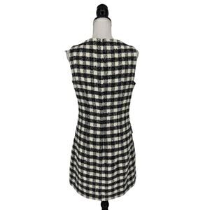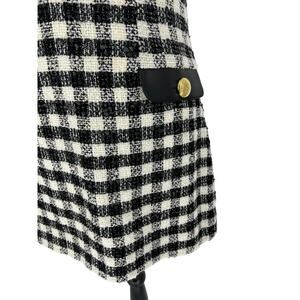 An iconic silhouette from luxury label Rowen Rose, this houndstooth mini dress features striking black and white tweed enhanced by sleek faux leather trim for a modern edge. Expertly crafted in Italy, this structured design flatters the figure with a tailored fit and classic check pattern. The faux leather detailing adds contrast and polish, while the two flap pockets adorned with gold-tone buttons offer signature Rowen Rose sophistication. Perfect for polished daywear or chic evenings out, this dress delivers timeless appeal with a bold twist. Fully lined for comfort.