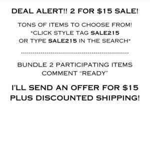 DEAL ALERT! Check out this awesome SALE! BUNDLE THIS ITEM WITH ANOTHER 2/$15 ITEM IN MY CLOSET, COMMENT “READY” AND I’LL SEND $15 OFFER WITH DISCOUNTED SHIPPING!!! There are tons of participating items to choose from! To find these items, type SALE215 in the search bar on Poshmark or click the SALE215 style tag on this inventory