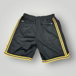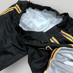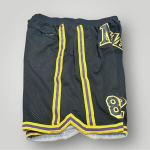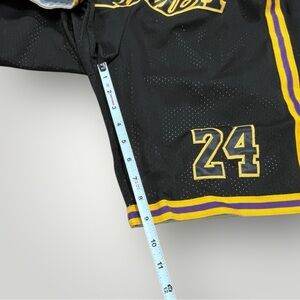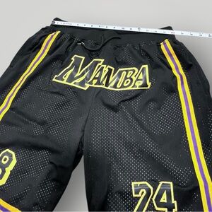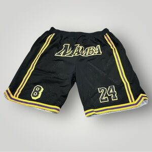 Kobe Bryant Lakers black shorts with yellow stripes. MAMBA 8 and 25 on the front. Inner mesh, elastic waist with drawstring, pockets in front and back with zipper closure. Excellent preowned construction, like new! See details and measurements in photos!