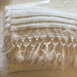 Elegant white towel with tassel detailing. Perfect for bathroom decor.