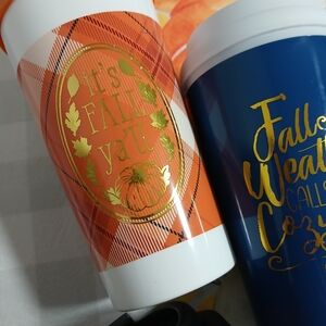 Celebrate the season with this Autumn Collection of Travel Mugs. Featuring vibrant fall and Halloween designs. They have all been used but will be sanitized again upon shipping. They're all cute I just have too many.