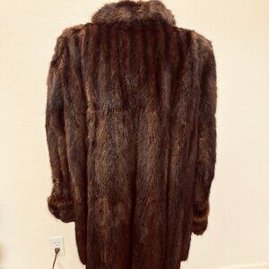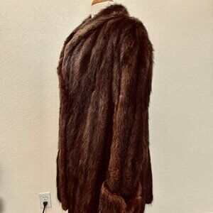 Vintage real mink fur coat from the 60s. Lovely condition and very warm. Features 2 front pockets, fully lined, 1 hook and eye closure, cuffed sleeves. Very soft deep brown fur. Classic coat design from that era. No size tag but measures as an XL. Made by Brandenburg Furs.
