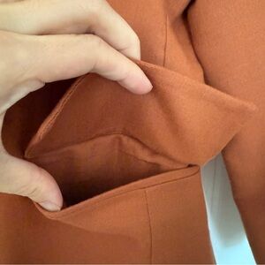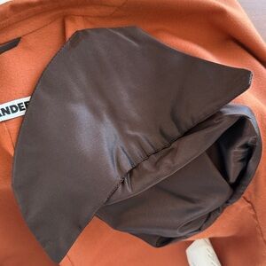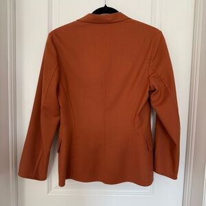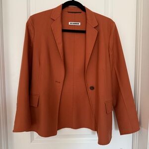 Stylish Jil Sander blazer in a rich rust color. Shoulders are very lightly padded. Ideal for a chic, modern fall look.