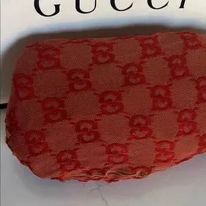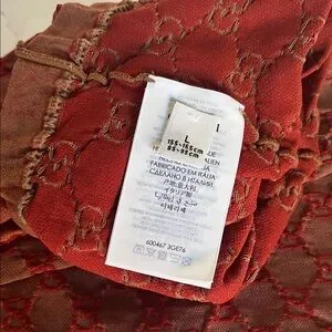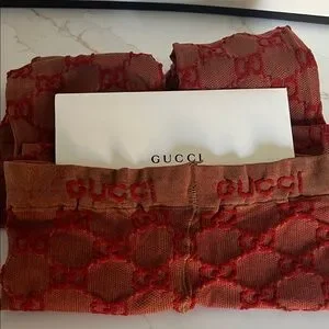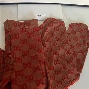 Elegant Gucci tights with orange/red and nude design. Iconic style.