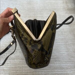 Elegant satchel with olive snake print. Features strong handles and a sophisticated design. Made from real leather