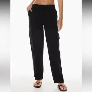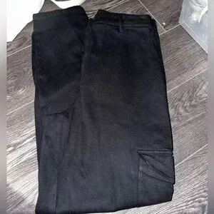 Stylish black cargo pants. Features side pockets. Comfortable fit.