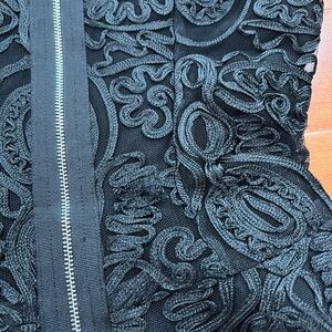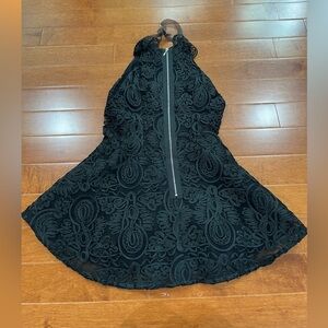 Details: Beautiful black lace; lined; closes at back w zipper; black sheer ribbon tie at neck