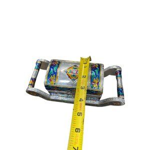 This elegant handcrafted trinket box showcases intricate floral designs in vibrant enamel coloring, set against a polished silver background. Its unique design features delicate handles, making it a statement piece for any collection. Ideal for storing small treasures, this box combines functionality with exquisite artistry, enhancing any decor setting. No defects. Beautiful. SKU 9145