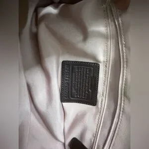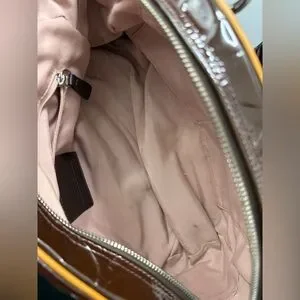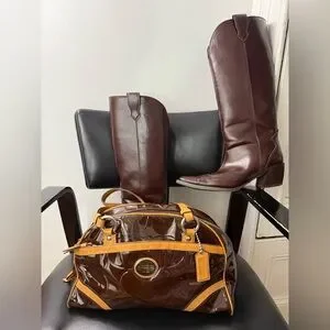 Brown and tan Coach patented leather oblong monogram coach logo embossed shoulder bag.